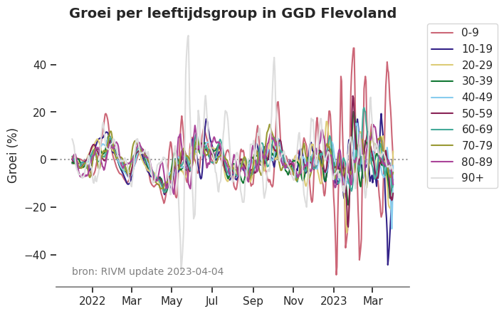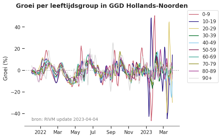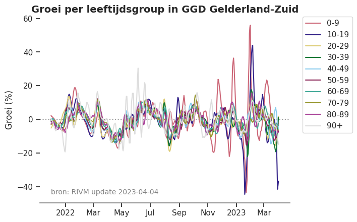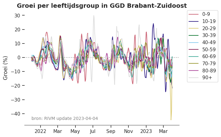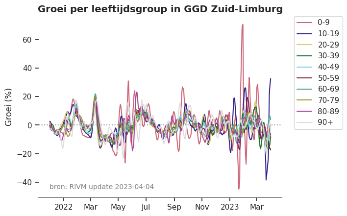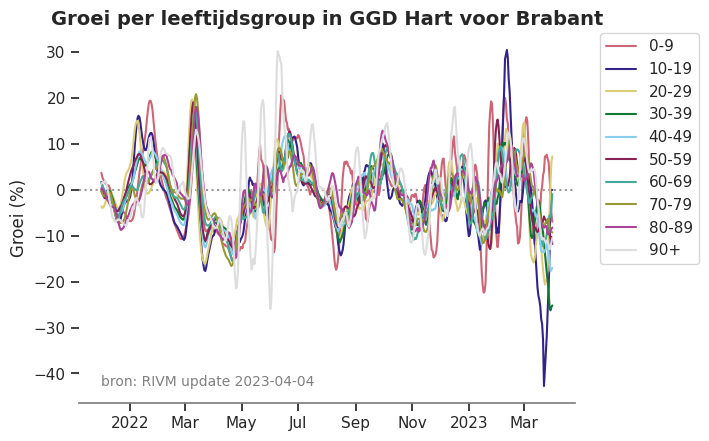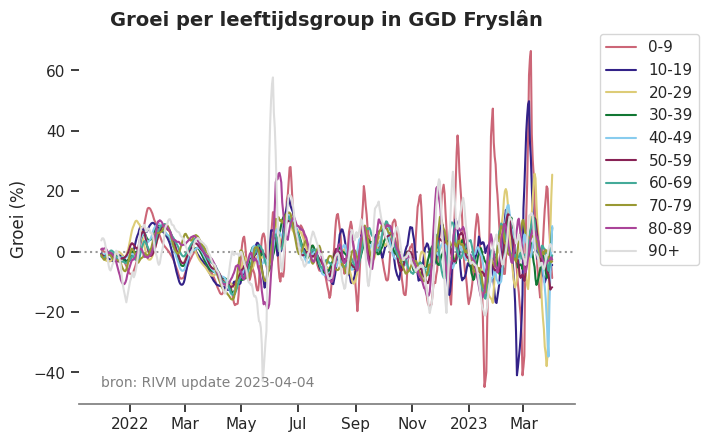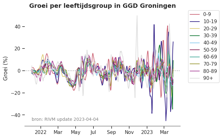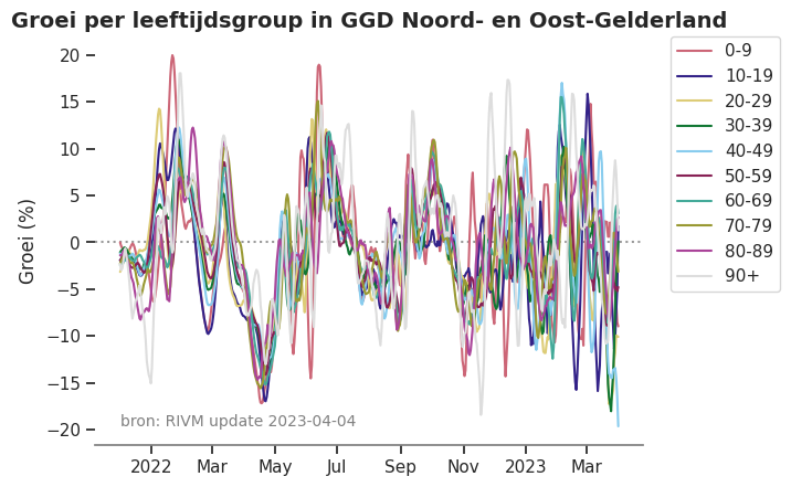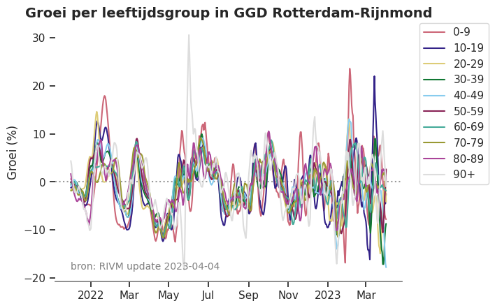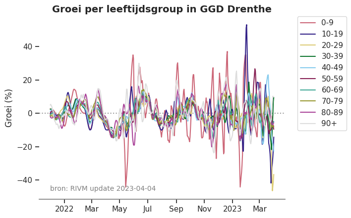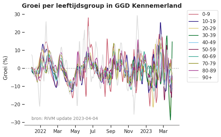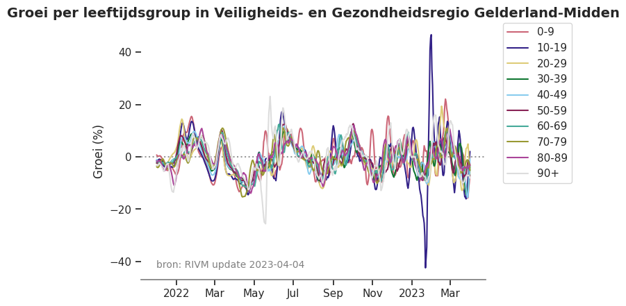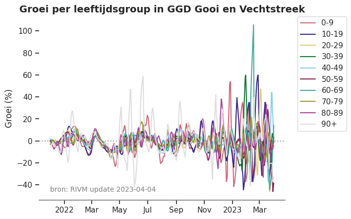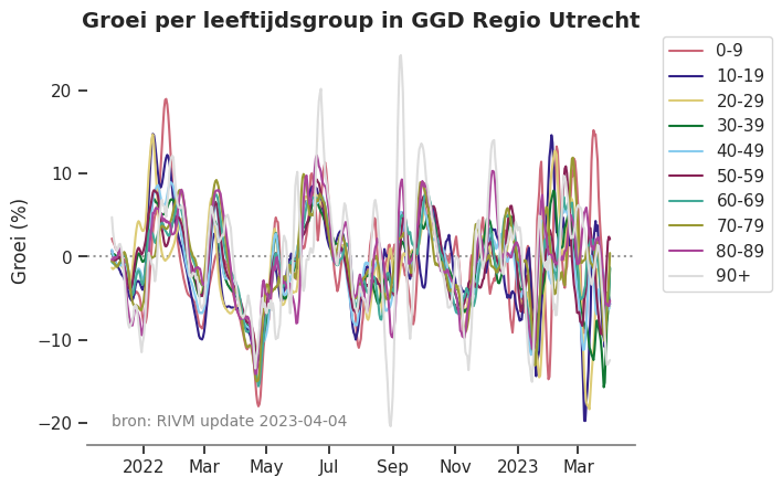 s.set_title("Groei per leeftijdsgroup in " + ggdName, fontdict={'fontsize':14,'fontweight': 'bold'})