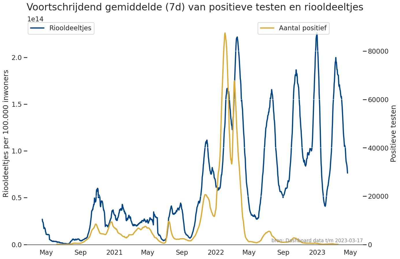 ax.set_title('Voortschrijdend gemiddelde (7d) van positieve testen en riooldeeltjes', pad=30)